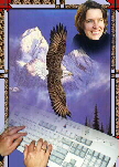 I really like the outdoors and the mountains so I knew I needed some outdoor setting in my self portrait, preferrably with mountains. And everyone who knows me knows I spend too much time on my computer. But the computer is what sets my creativity soaring so I thought of the keyboard and the eagle. I also like quilting and sewing and many other crafts, thus the quilted boarder.