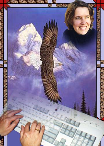 I really like the outdoors and the mountains so I knew I needed some outdoor setting in my self portrait, preferrably with mountains. And everyone who knows me knows I spend too much time on my computer. But the computer is what sets my creativity soaring so I thought of the keyboard and the eagle. I also like quilting and sewing and many other crafts, thus the quilted boarder.